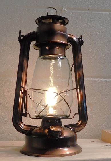 This Bronze Kerosene lantern has been converted to electric. It comes with an Edison Style Candelabra LED bulb. It is 7 inches in diameter and is 12 inches tall.