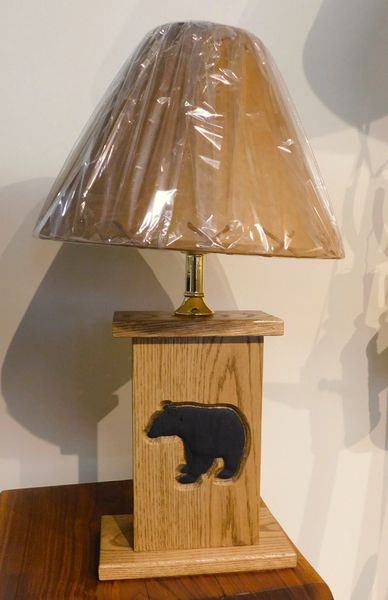 This carved Bear Lamp is 24 inches tall, 9 inches wide and 5 1/4 inches deep. The wood is red oak with a hand painted black bear in the center.