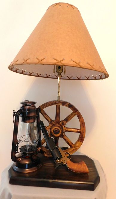 A colt replica revolver highlights this lamp mounted to a weathered wagon wheel on an antiqued pine base. A separate switch controls a bronze lantern with a flicker bulb. Lampshade is a rawhide look with leather lacing. 28 inches high 16 inches wide and 9 1/2 deep.